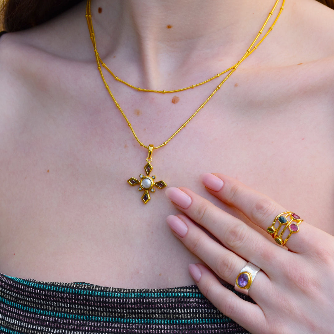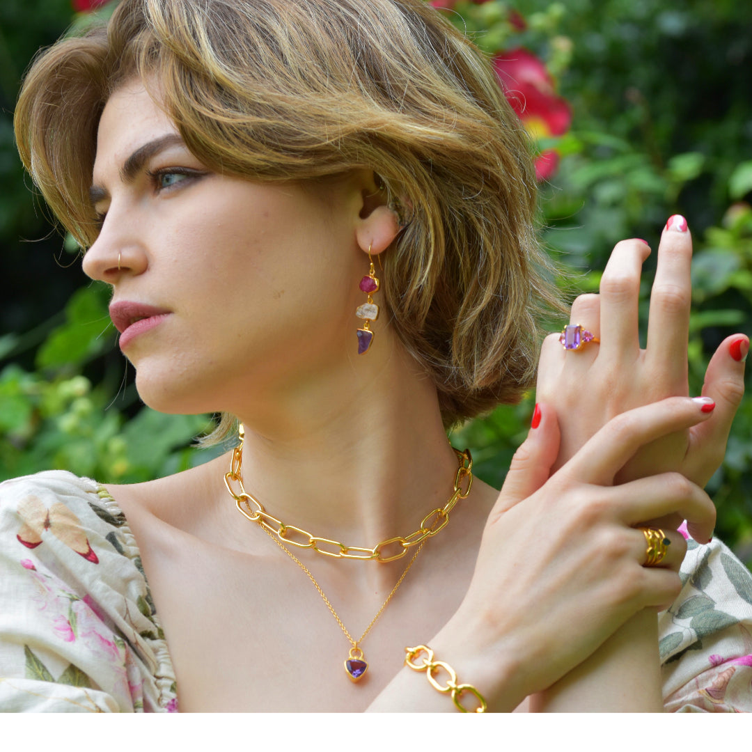 Our pieces are handmade in Jaipur, a city where jewellery is not just worn, but revered. Working closely with a small team of skilled artisans, we honour both heritage techniques and modern forms. Every detail is considered. Every gemstone placed with care. The result: jewellery that holds emotion, energy and elegance.
