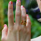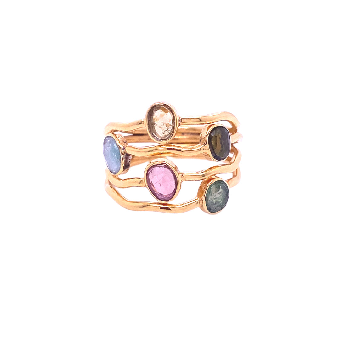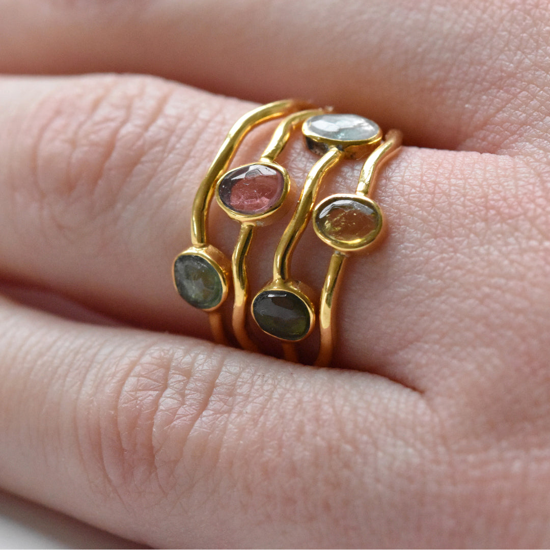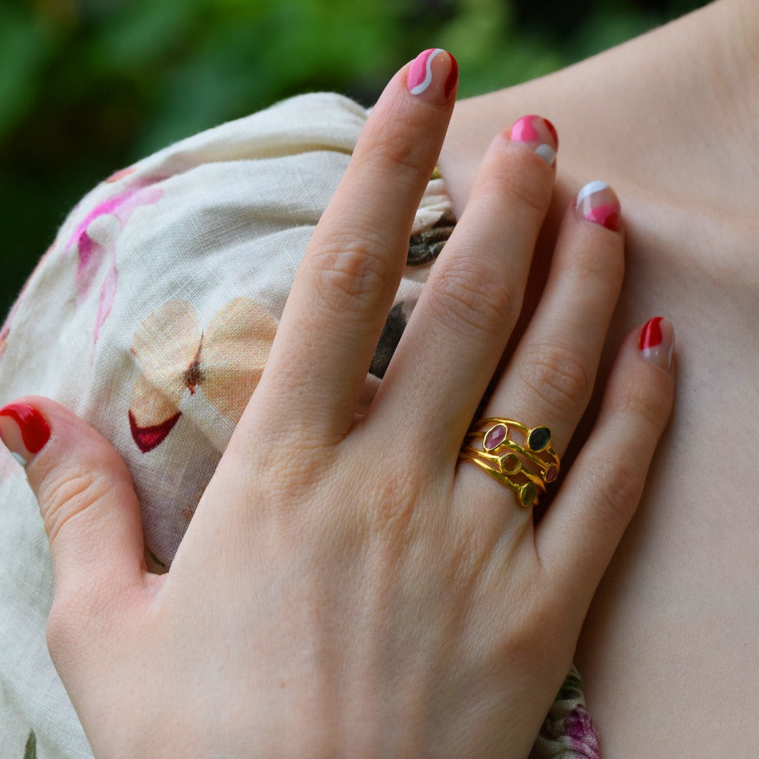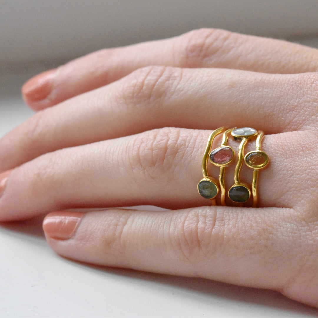 This Marianina Ring is an exquisite and timeless piece of jewellery. Handcrafted from recycled .925 sterling silver and 2.5 microns of recycled 18k gold vermeil, this 4 band, wavy, organic gold ring features 5 flat-cut, multi tourmaline gemstones.