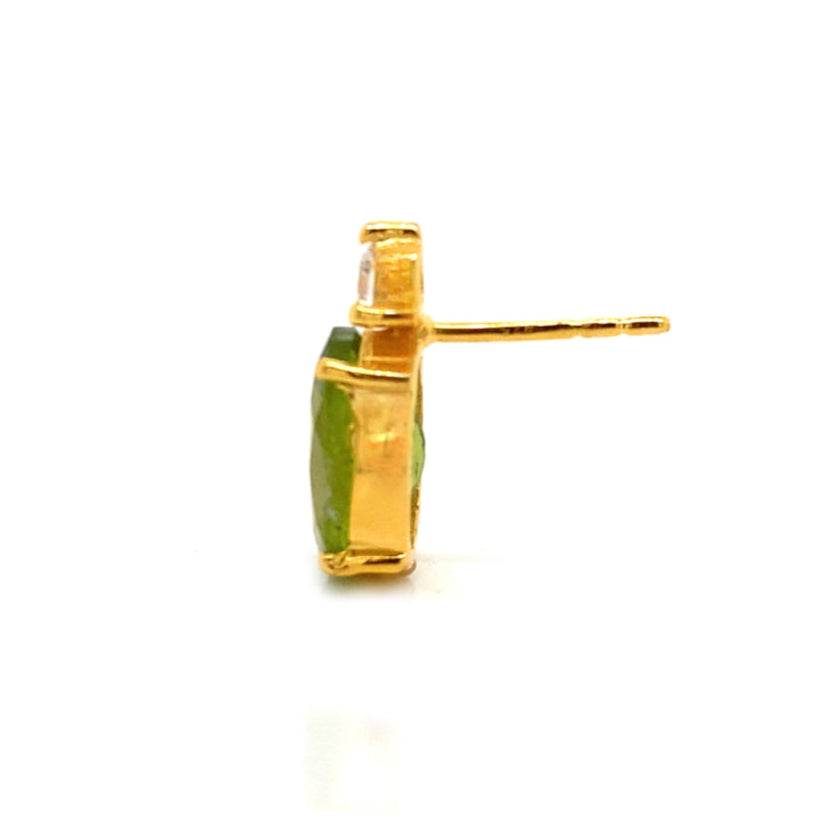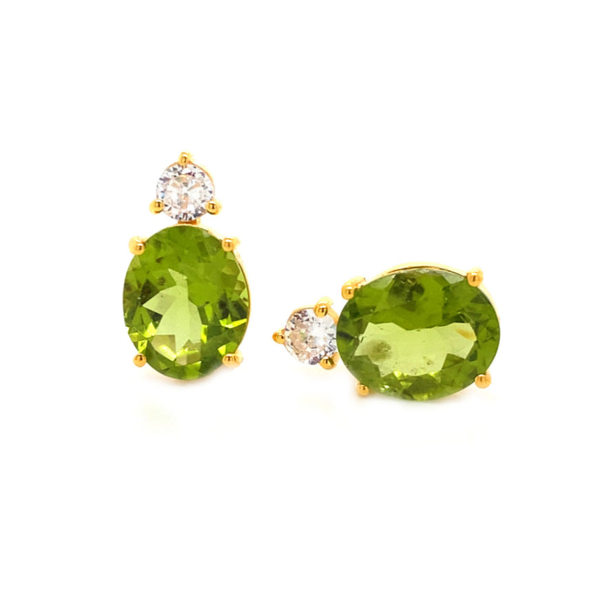 Each earring is crafted with meticulous care, featuring an oval-shaped, beautifully faceted peridot gemstone secured by four claws, and topped with a small cubic zirconia, held by three delicate claws, for added sparkle.