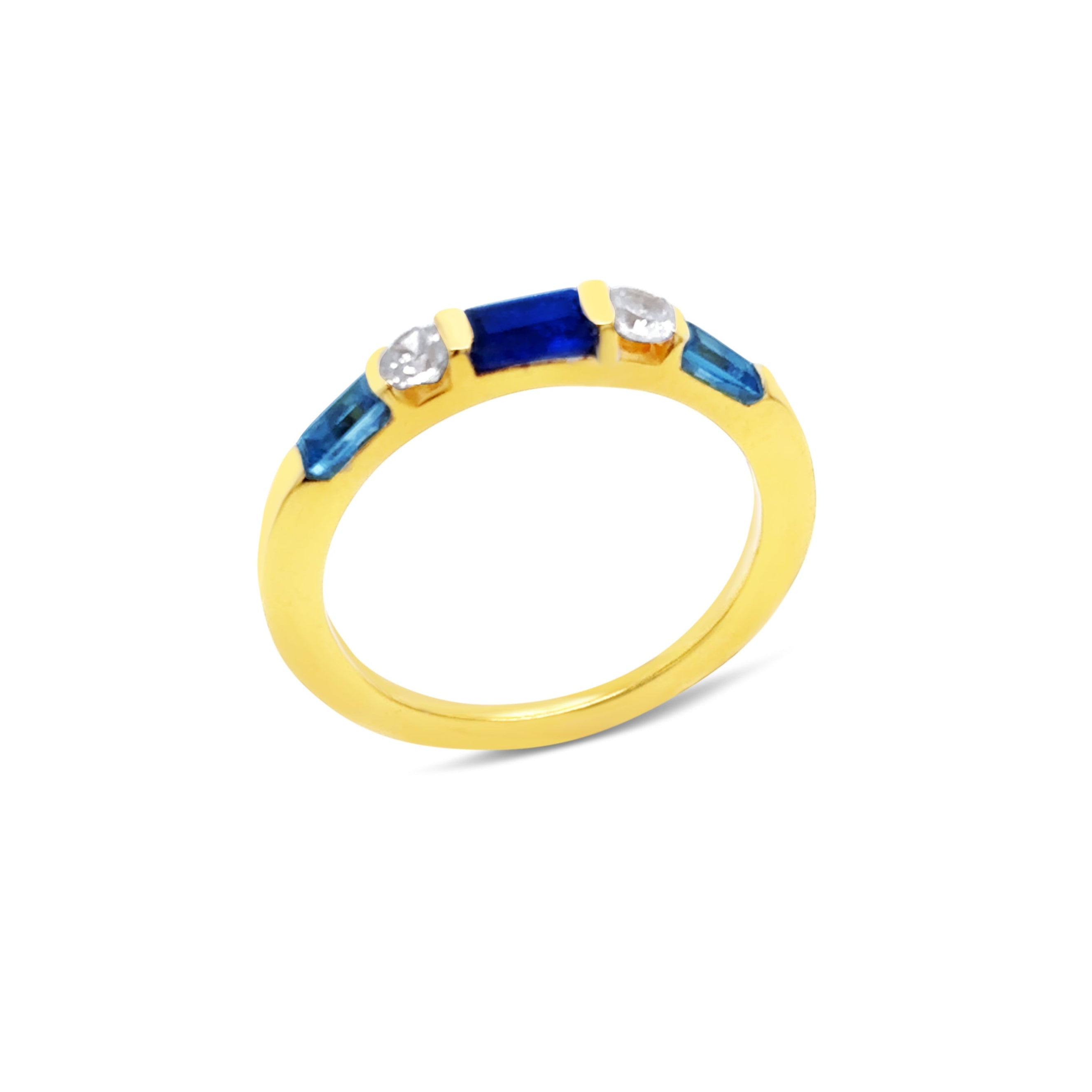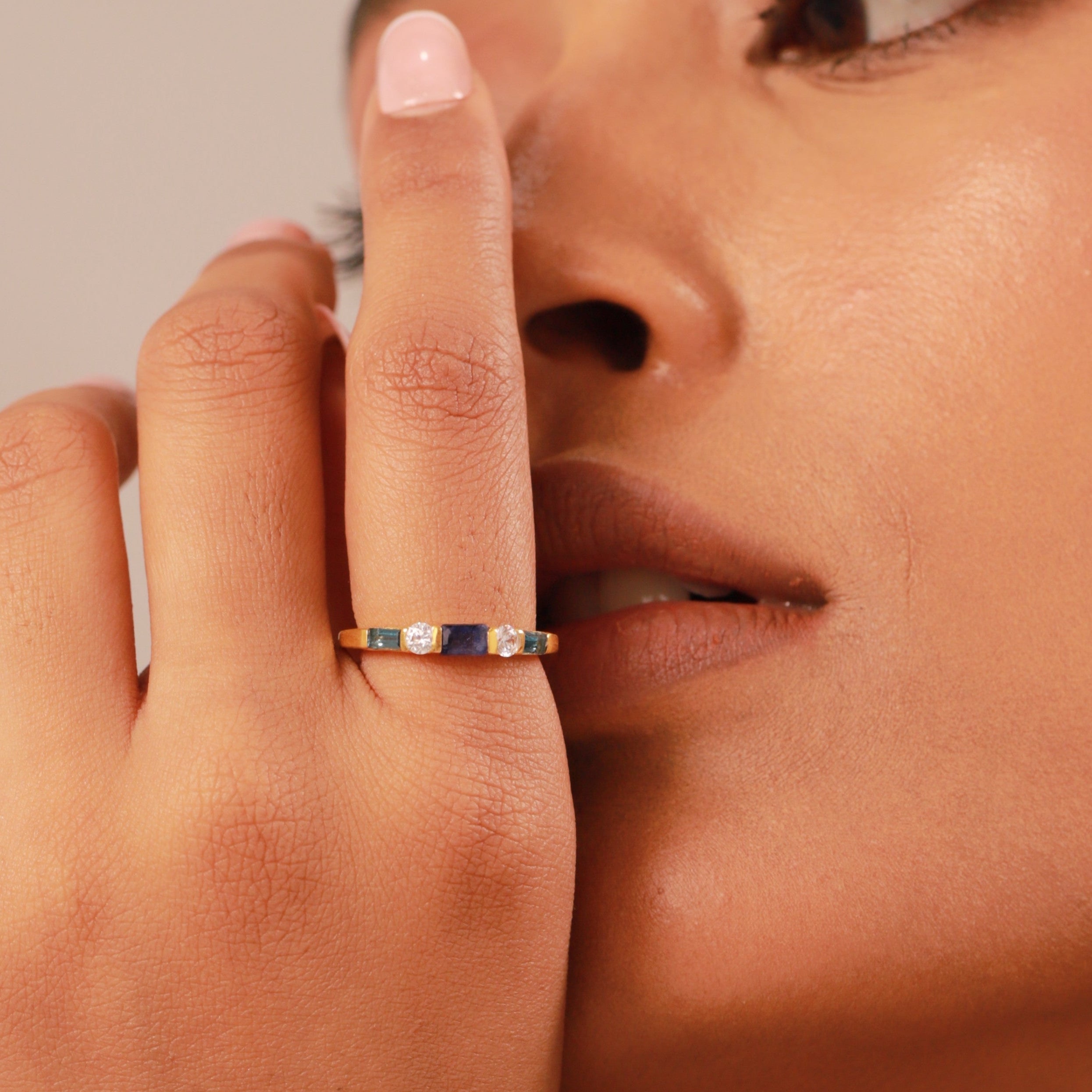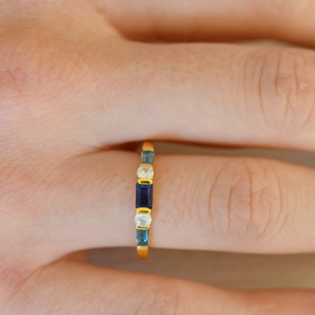 Our Theia Sapphire ring is an absolute beauty and aptly named after the goddess of divine light. A timeless classic, it features three stunning baguette-cut gemstones: a central sapphire, two vibrant London blue topaz gemstones and two sparkling round cubic zirconia. The combination of deep sapphire blue, with the electric London blue, and dazzling cubic zirconia creates a mesmerizing contrast that truly catches the eye.