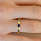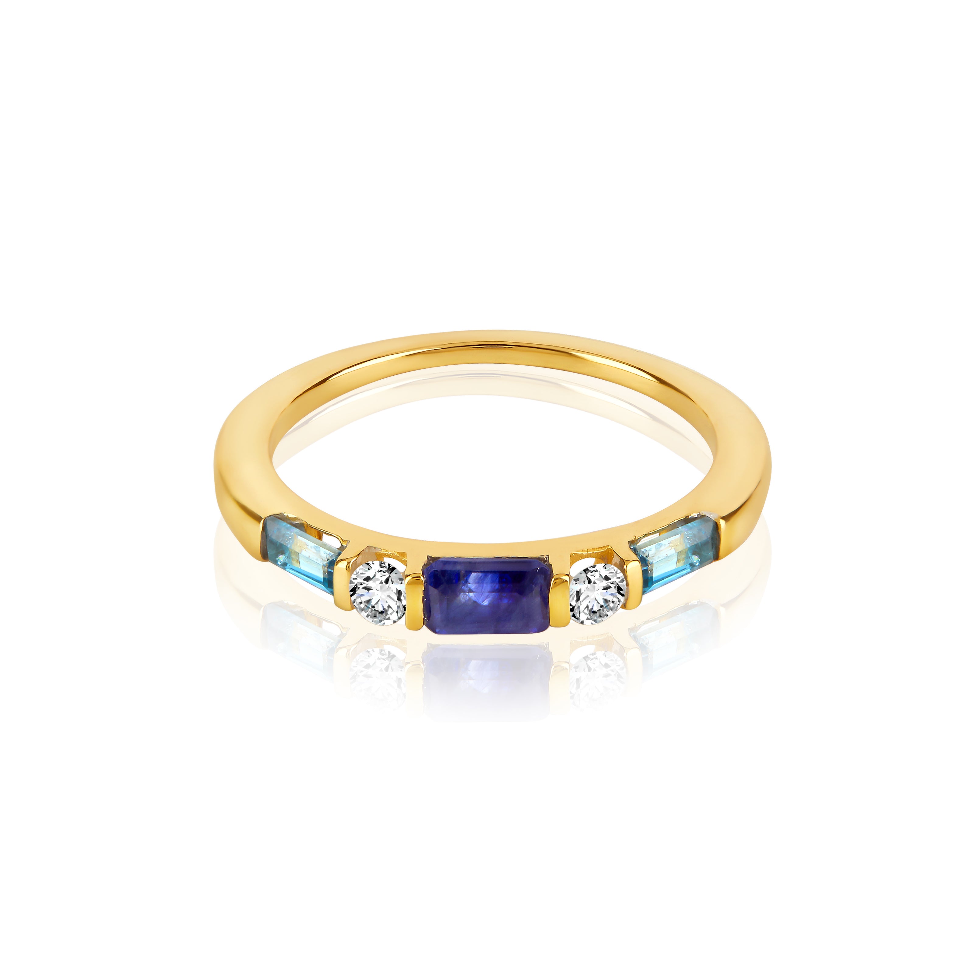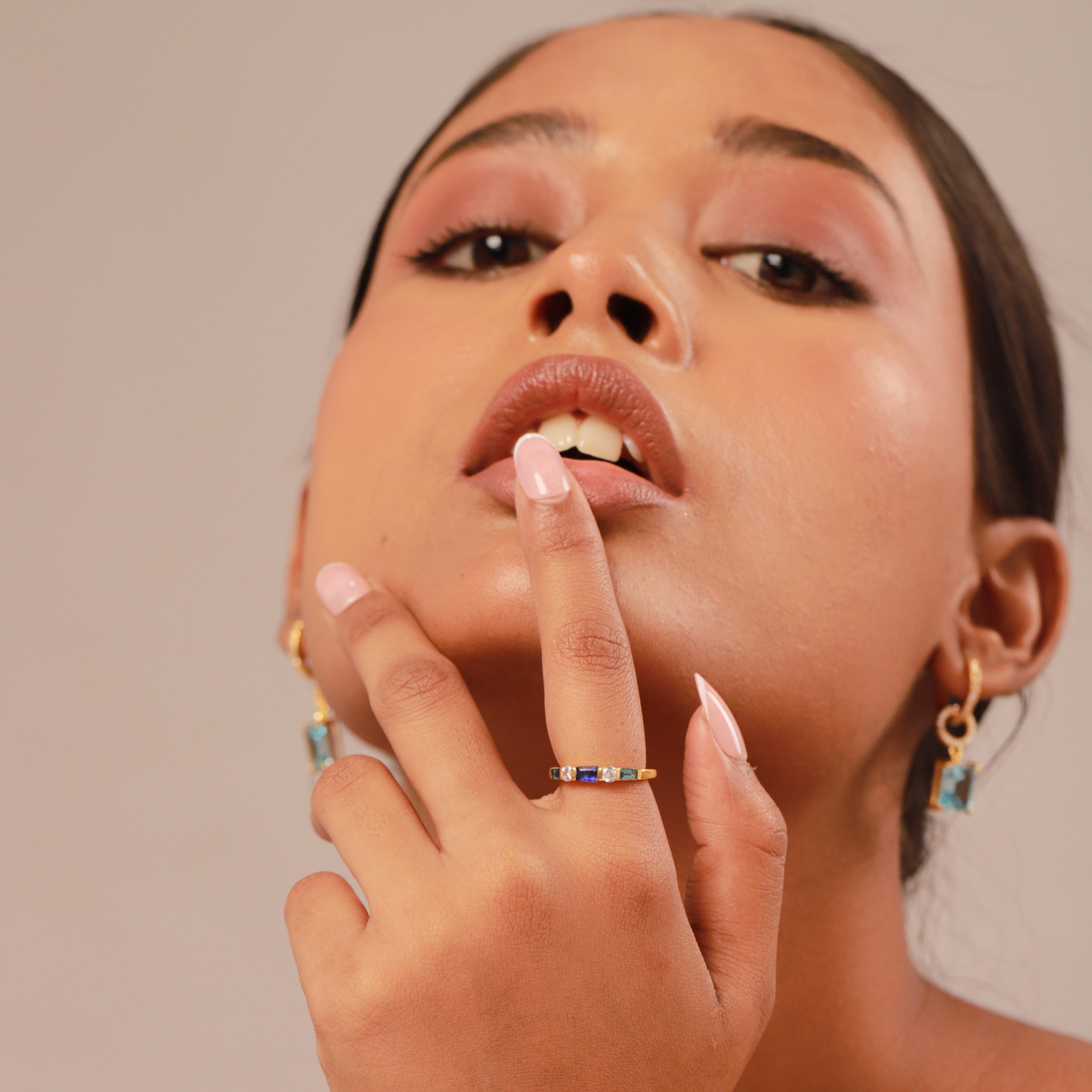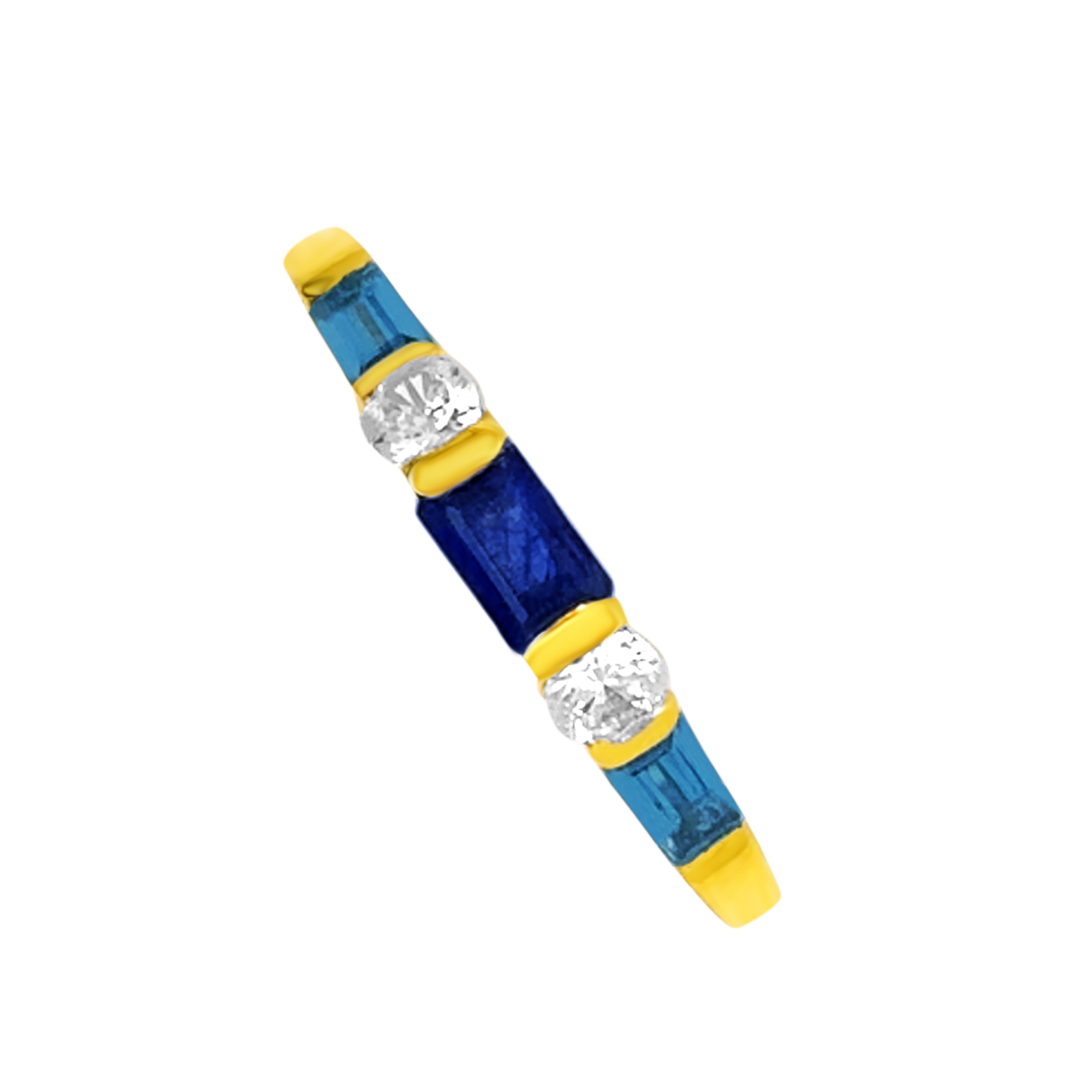 Our Theia Sapphire ring is an absolute beauty and aptly named after the goddess of divine light. A timeless classic, it features three stunning baguette-cut gemstones: a central sapphire, two vibrant London blue topaz gemstones and two sparkling round cubic zirconia. The combination of deep sapphire blue, with the electric London blue, and dazzling cubic zirconia creates a mesmerizing contrast that truly catches the eye.