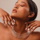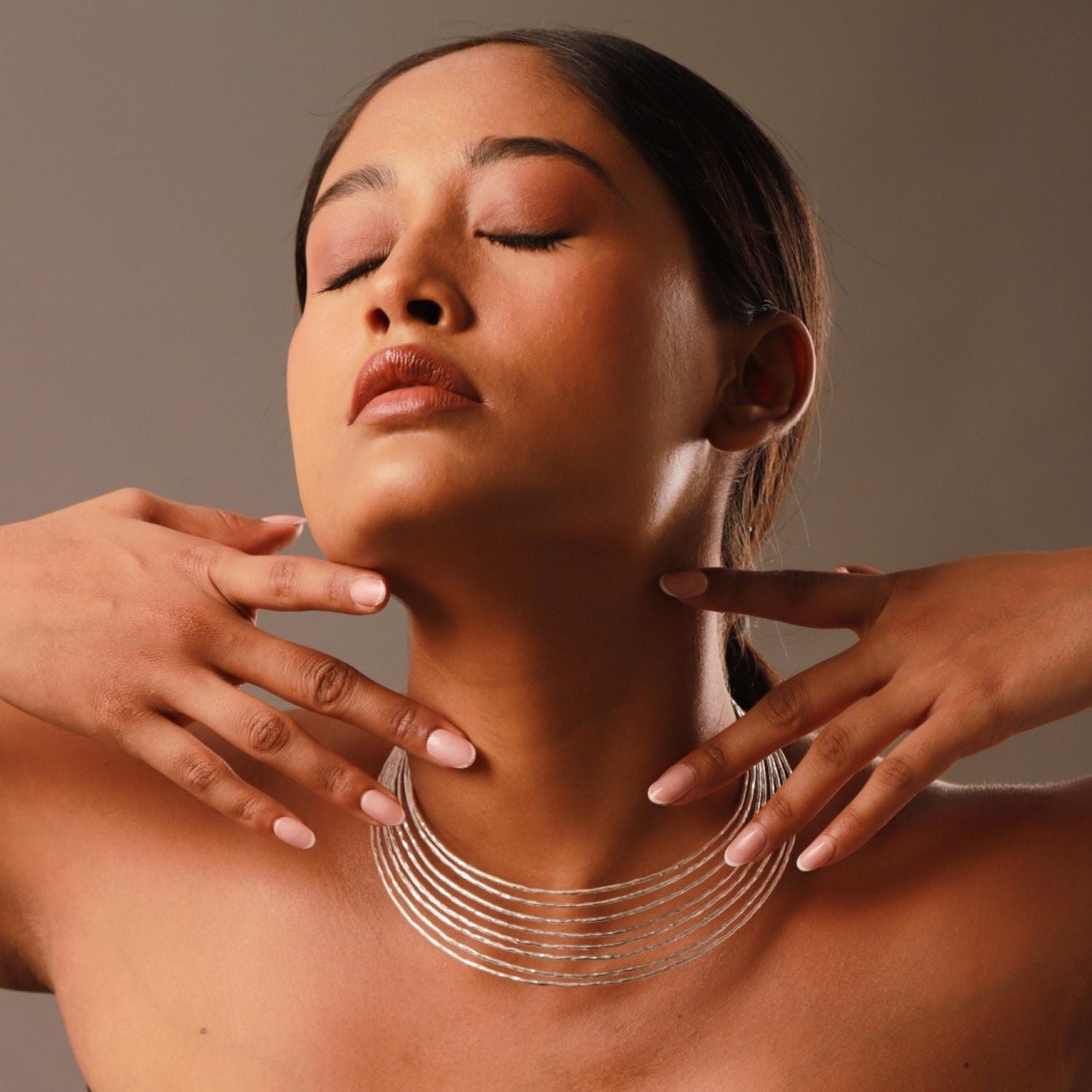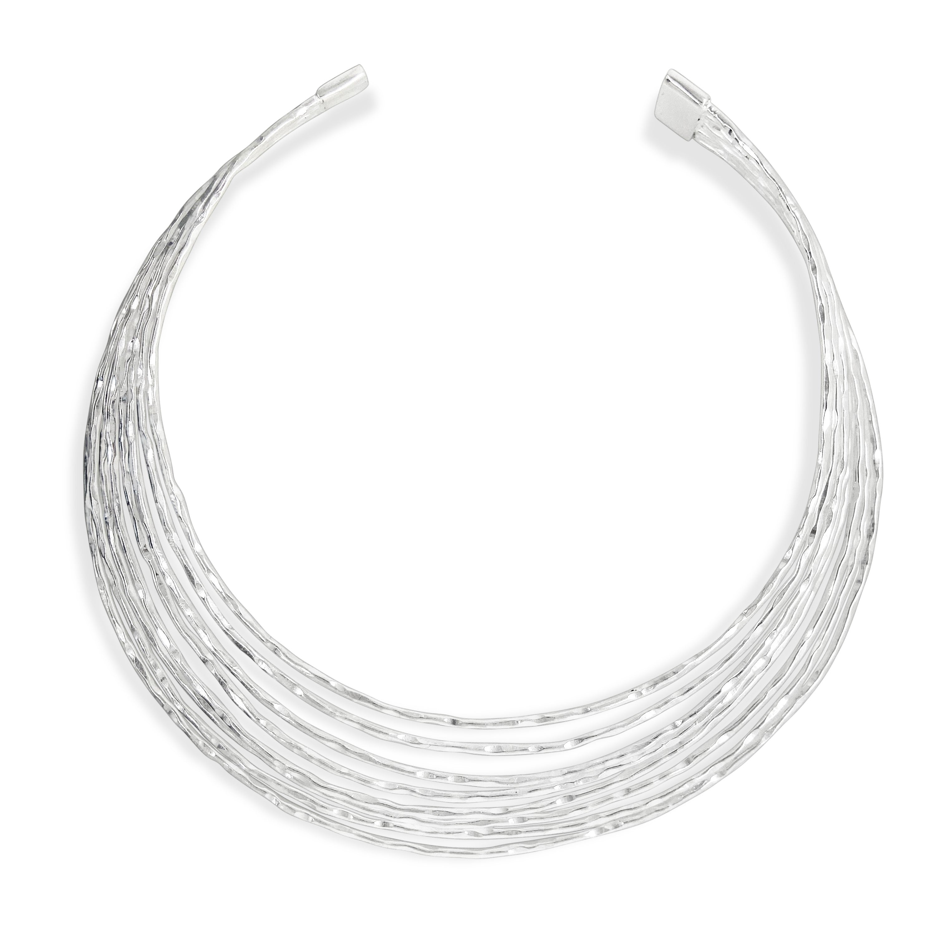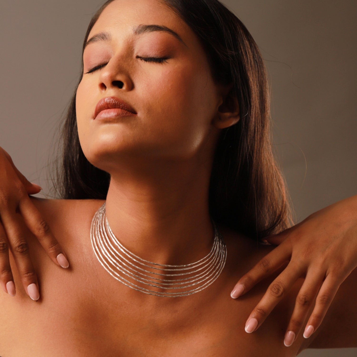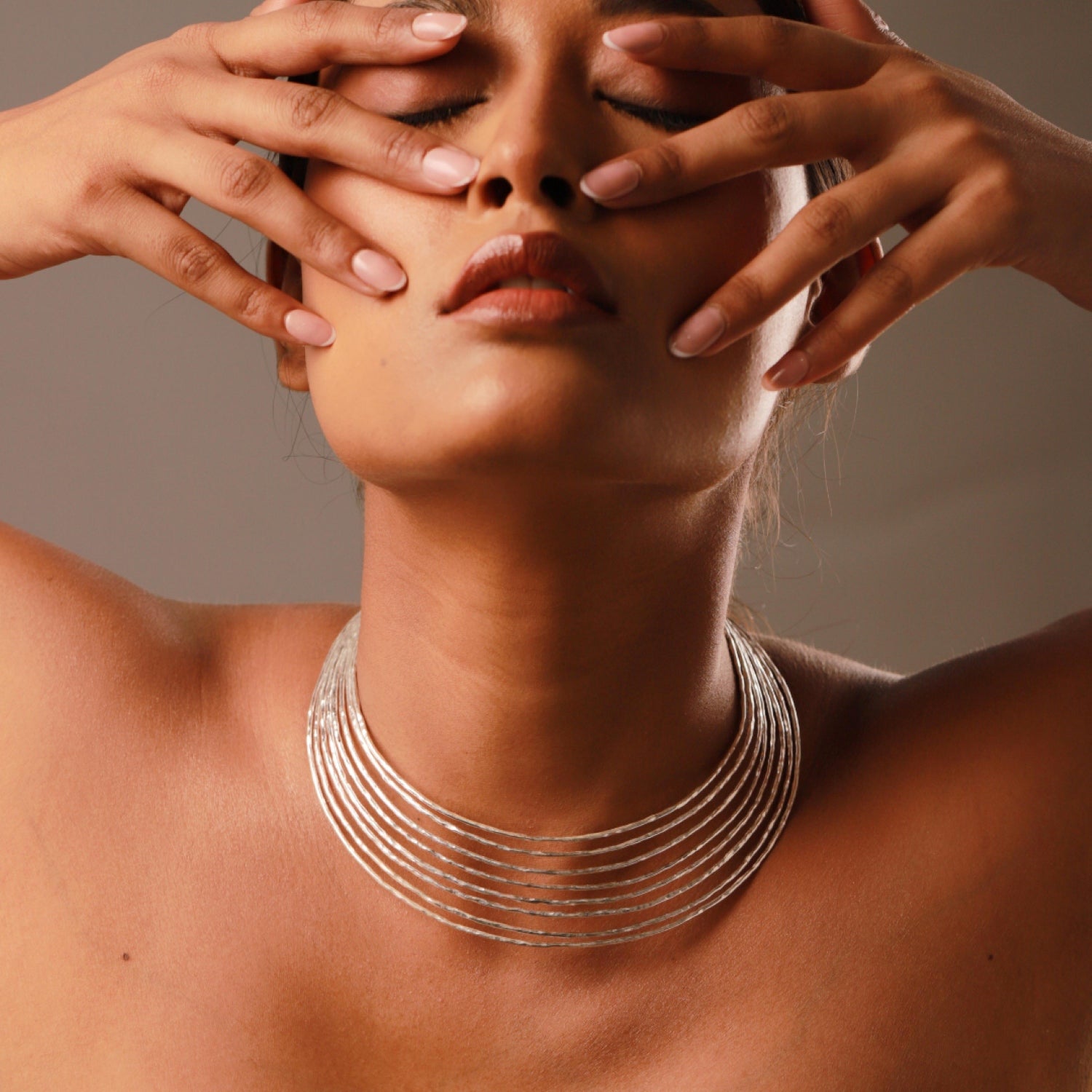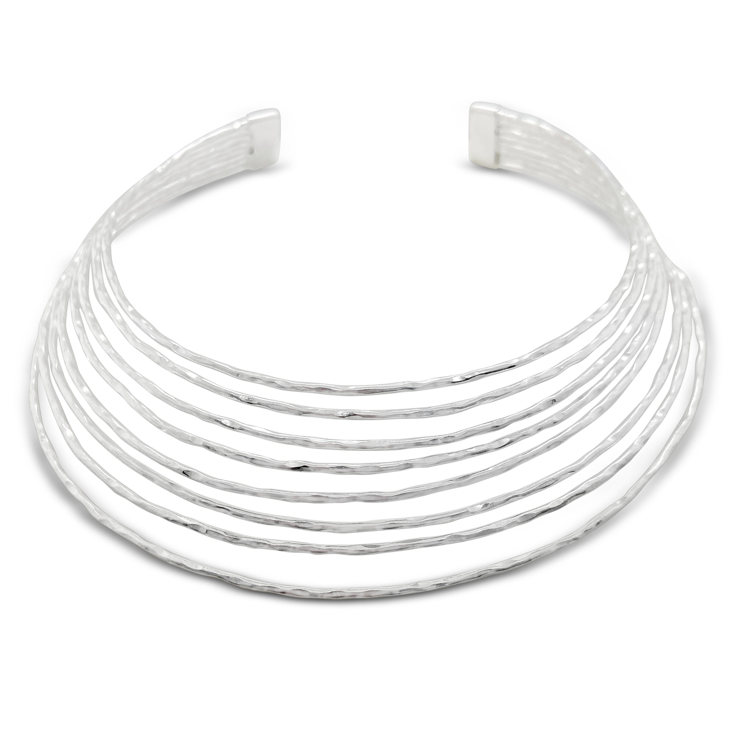 This silver collar and its accompanying cuff epitomize the essence of a "statement piece." Crafted to be both lightweight and comfortable, the choker snugly encircles the base of the neck, with the flexibility to adjust the fit by simply squeezing or opening the back.