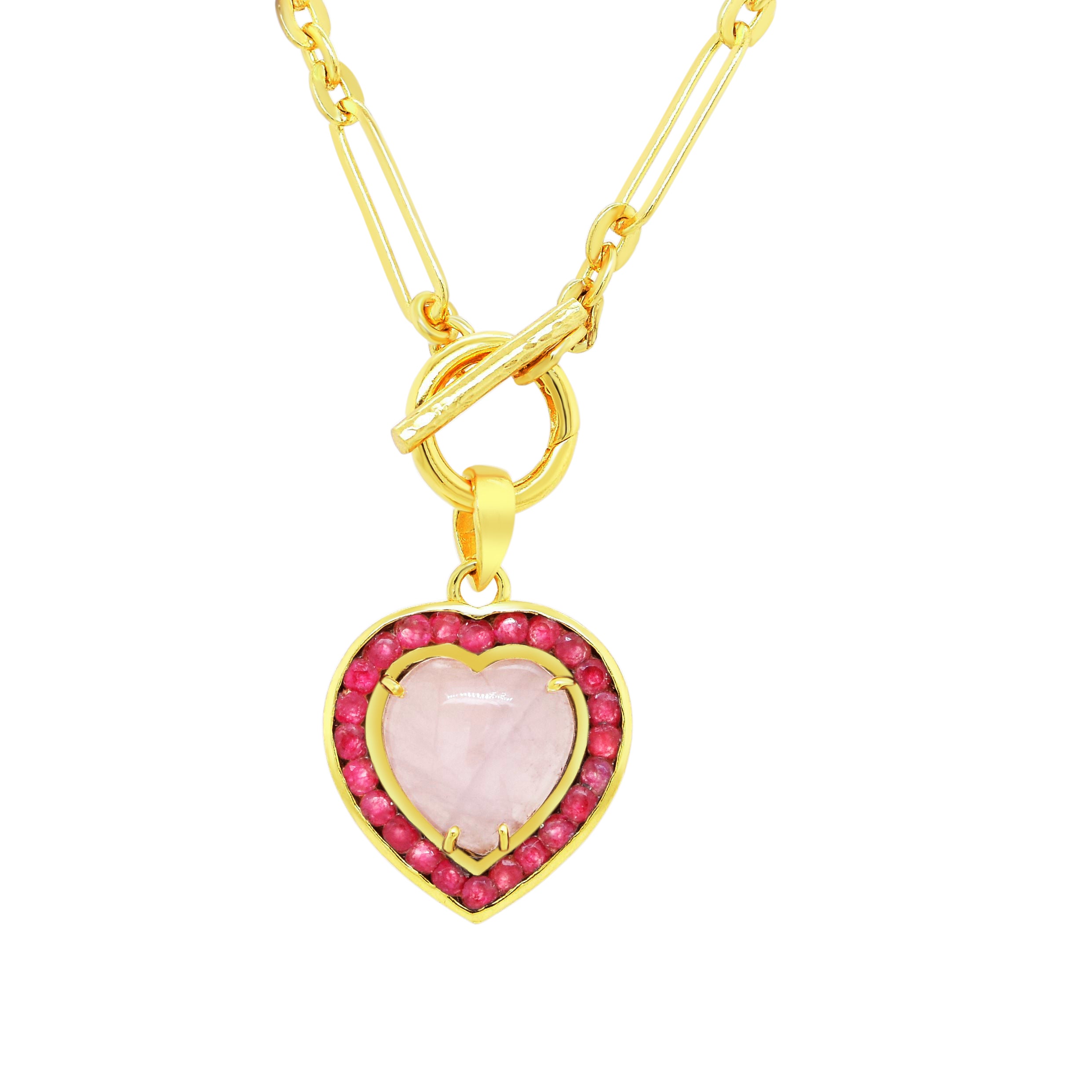 It showcases a stunning heart-shaped rose quartz gemstone, the stone of universal love and compassion, in all its glorious pink softness; framed by a gold surround and encircled with rich fuschia chalcedony in an elegant channel setting.