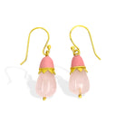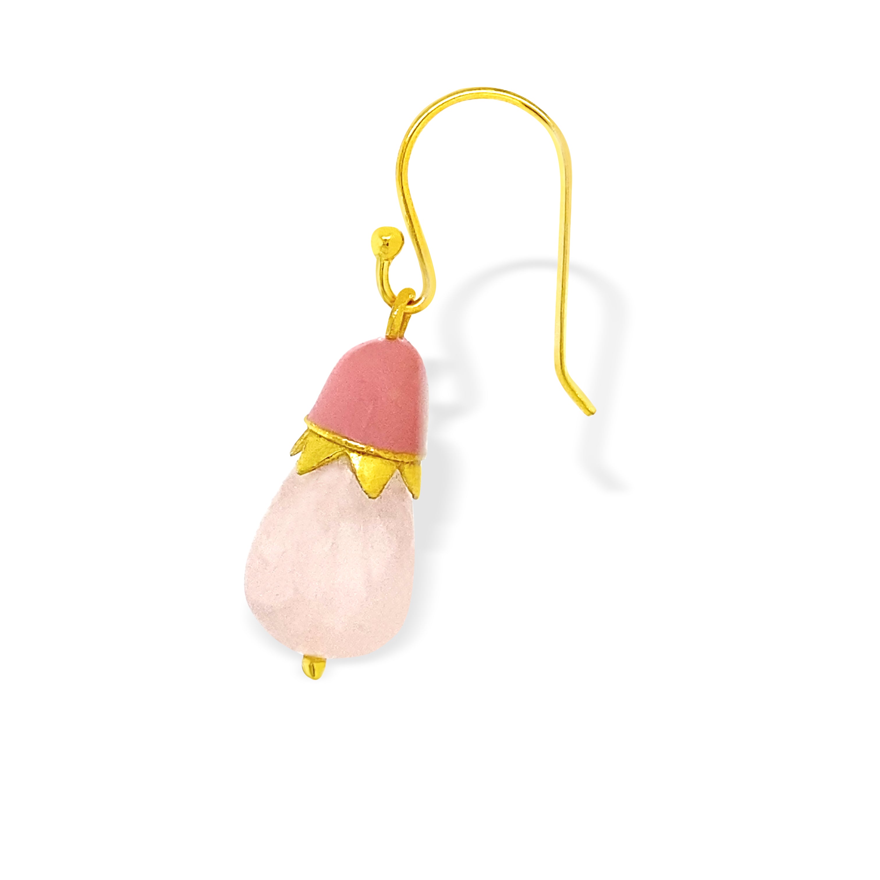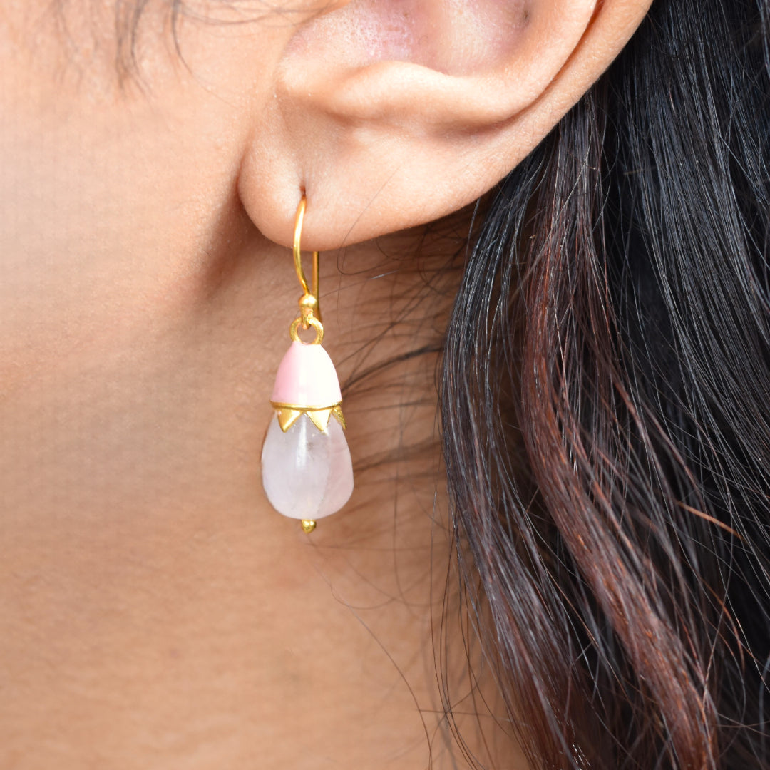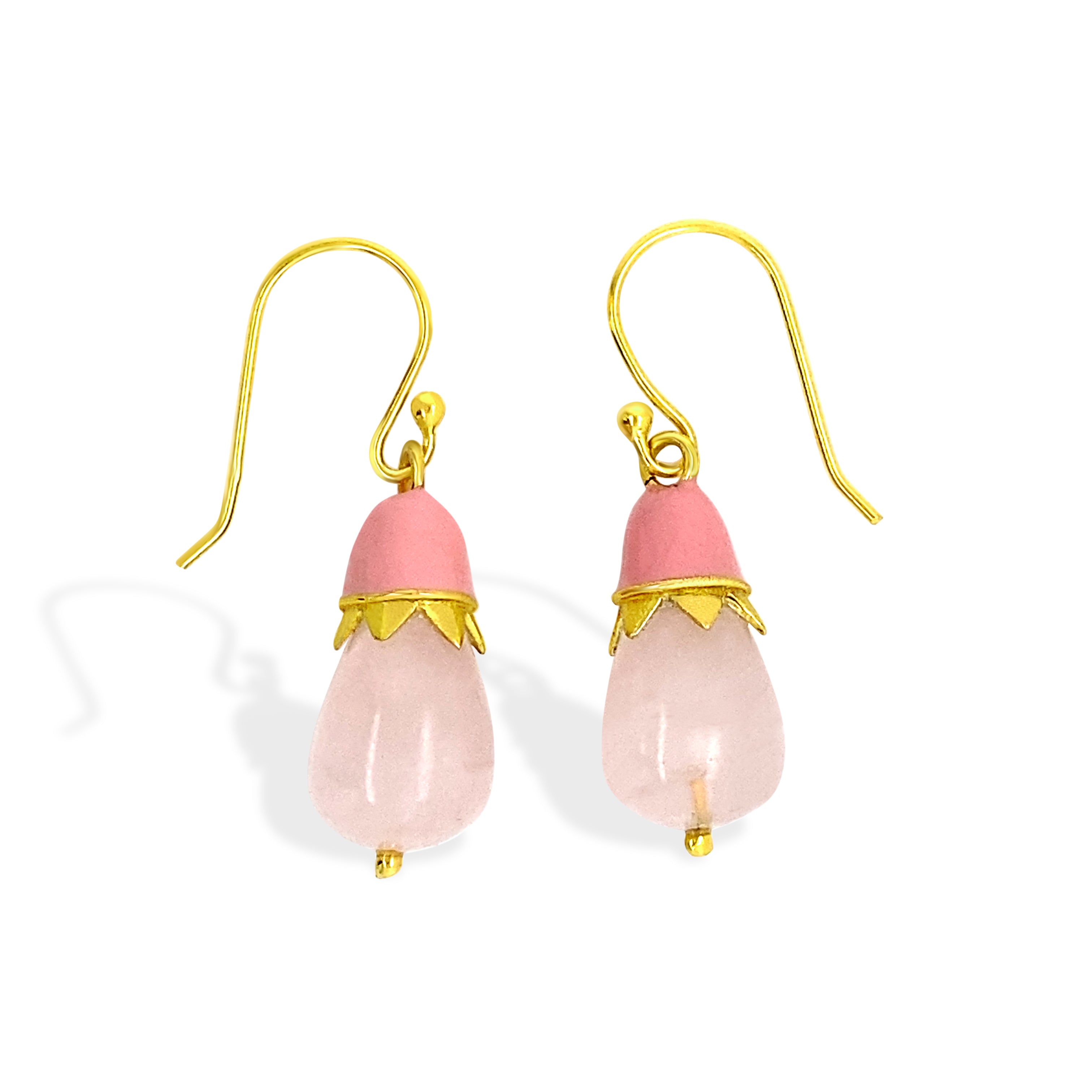 Suspended from a decorative hook, each earring features a large tear drop of rose quartz, adding a pop of color and elegance. Above the gemstone dangles a "top hat" of pink enamel, adorned with an enchanting crown motif in gold, creating a delightful contrast between the materials. Completing the design is a tiny gold ball at the bottom of the gemstone, adding a touch of whimsy.