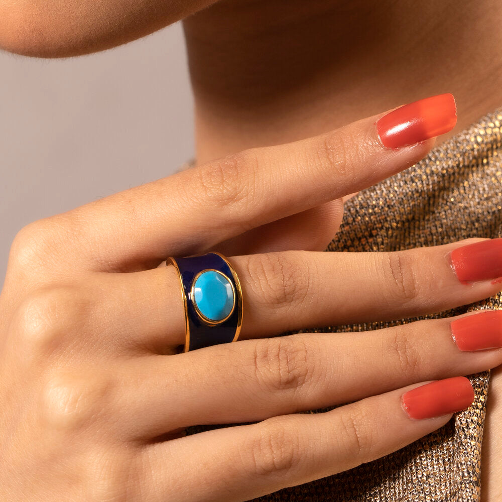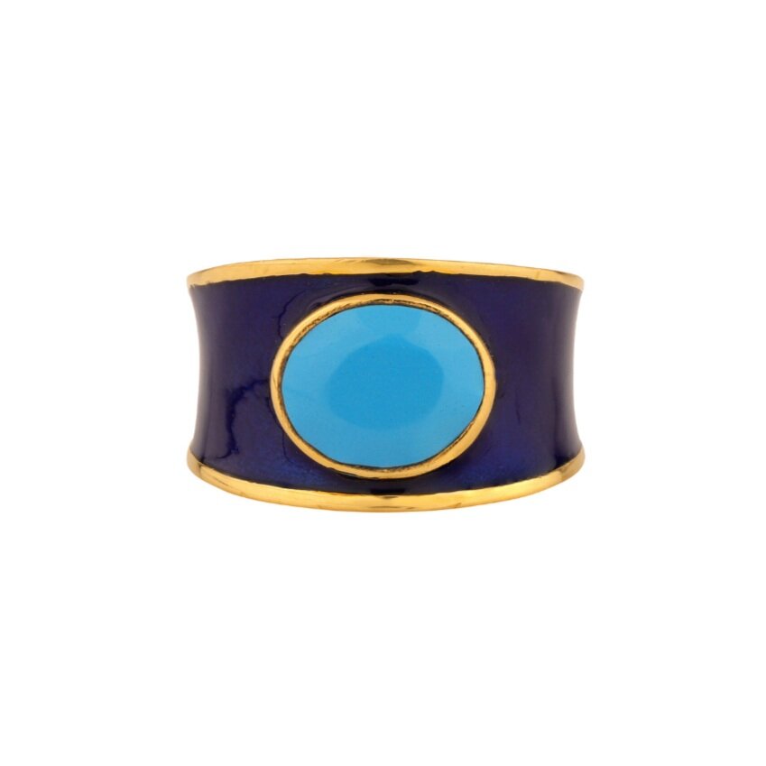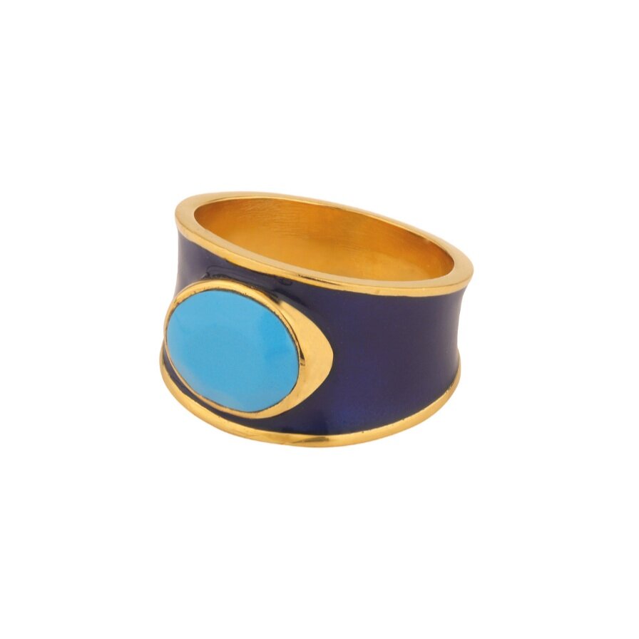Featuring a wide band of vibrant navy blue enamel, it boasts a central large turquoise gemstone set in a gold mount with a gold rim to the ring.