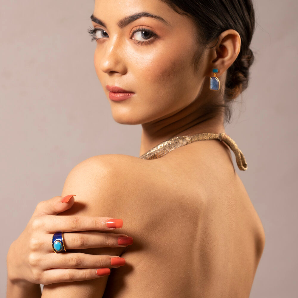 Our pieces are handmade in Jaipur, a city where jewellery is not just worn, but revered. Working closely with a small team of skilled artisans, we honour both heritage techniques and modern forms. Every detail is considered. Every gemstone placed with care. The result: jewellery that holds emotion, energy and elegance.